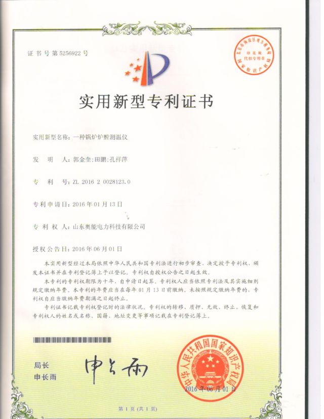 一种锅炉炉膛测温仪(专利证书)