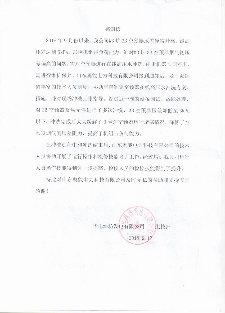 本合同分成A、B侧空预器两部分签订,华电潍坊发电有限公司#3机组为660MW燃煤机组,其烟气经SCR脱硝处理后,生成硫酸氢氨较多导致回转式空预器换热元件堵塞严重,热端及冷端压差逐渐升高,严重影响了锅炉的安全运行,在装完在线高压水冲洗装置后,运行稳定,压差高的时候就一键启动,自动冲洗,解决了厂内各位职工的运行工作压力,厂生技部多次对我公司表示感谢。